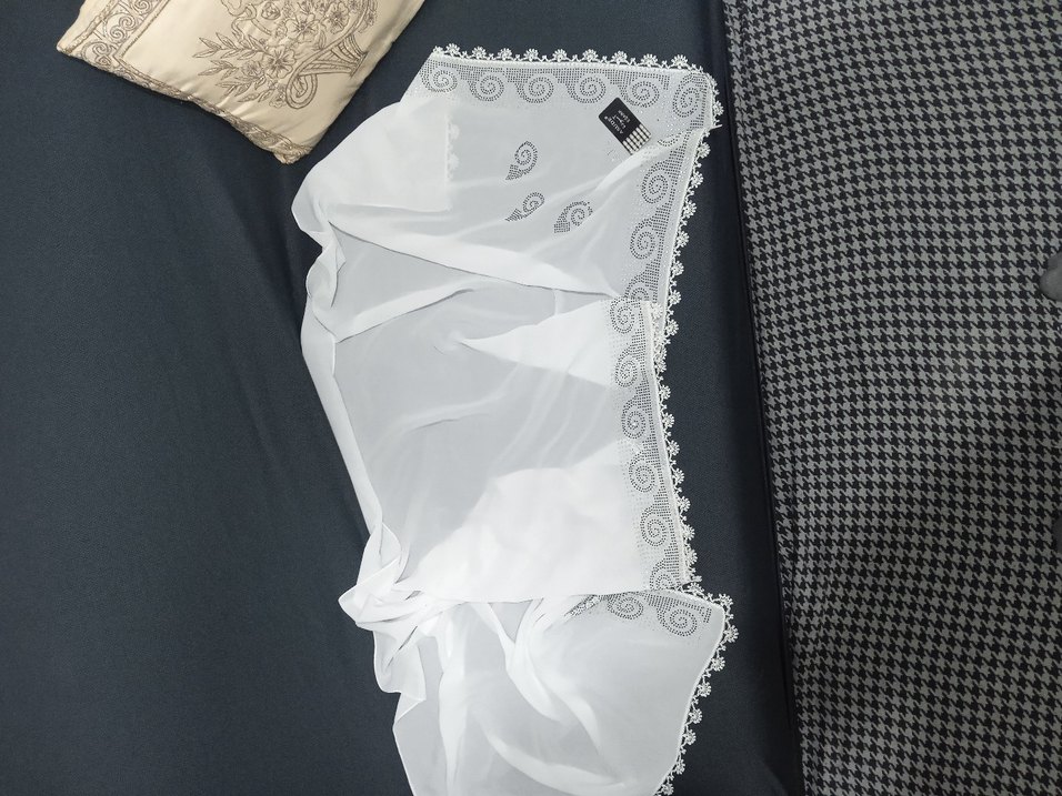 Bu kadın , dantel detaylı kenarları ve ipeksi beyaz kumaşıyla dikkat çekiyor. Klasik şıklığı bohem dokunuşla birleştirir. Yumuşak ve zarif bir aksesuar.