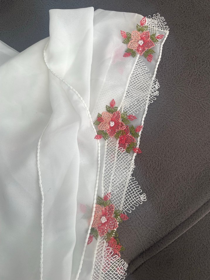 Pembe çiçek nakışlı dantel kenarları olan beyaz kadın fular. Hafif tekstil ve bohem tarzda.