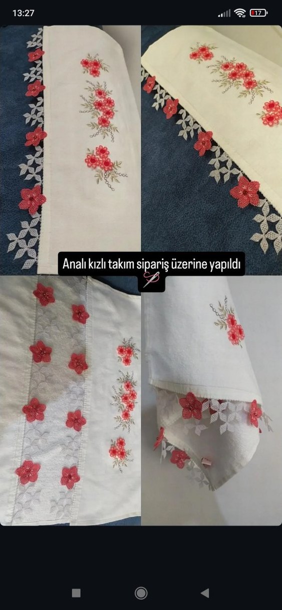 Beyaz ve gri renkte, kenarları kırmızı çiçek işlemeli konvansiyonel havlu takımı. Detaylı çiçek desenleriyle klasik bir görünüm sunar.