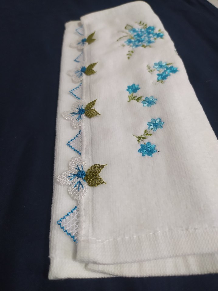 Beyaz renkte, kenarları mavi ve yeşil nakışlı çiçek desenleriyle süslenmiş yumuşak dokulu klasik havlu.