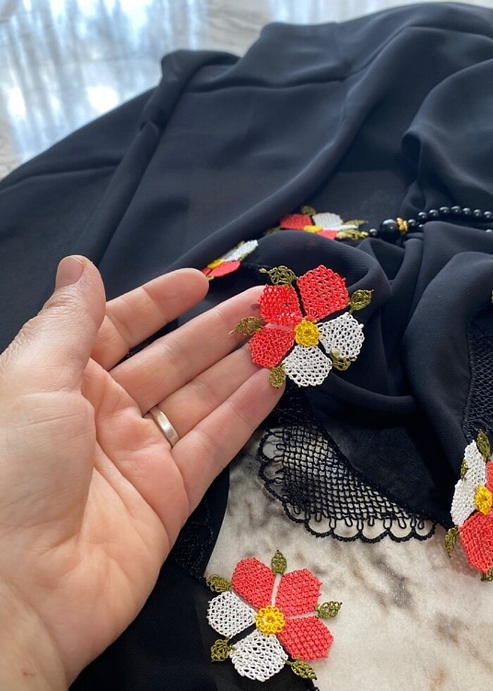 İğne oyası tespihlik takım siyah şifon üzerine yapılmıştır