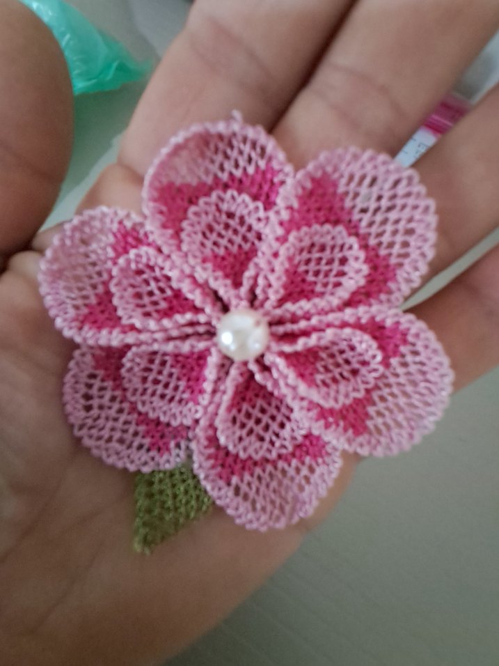 İğne oyasından yapılmış pembe çiçek şeklinde, ortasında inci detaylı vintage bohem tarzı broş. Günlük kullanım için uygundur. tac toka da olabilir