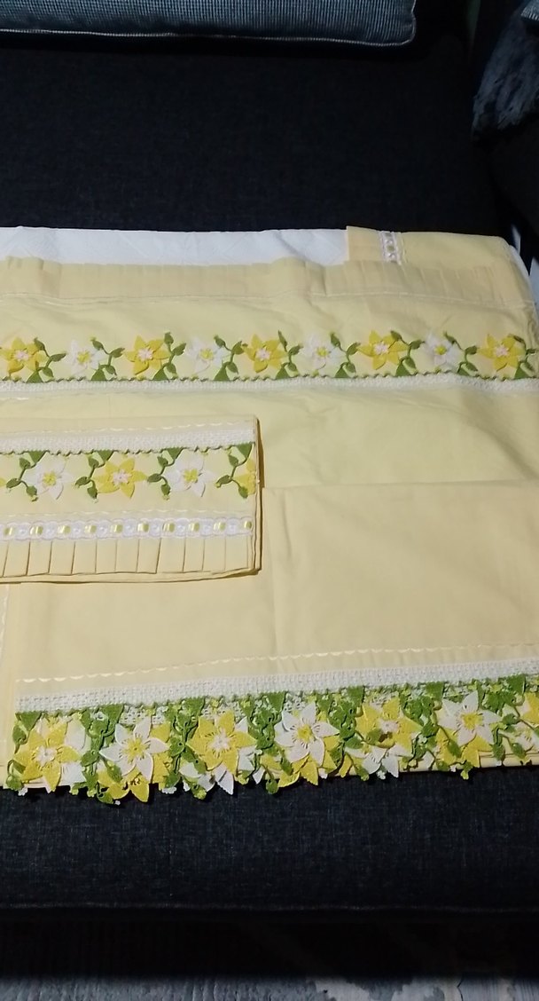 Pastel sarı renkte, iğne oyası detaylı pike takımı çarşaf iki adet yastık ve pikesi