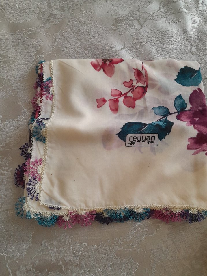igne oyali reyyan marka yazmaYumuşak sentetik kumaştan çok renkli pastel çiçek desenli, dantel kenarlı kadın fuları. Bohem tarzı ve 'reyyan' markalı.