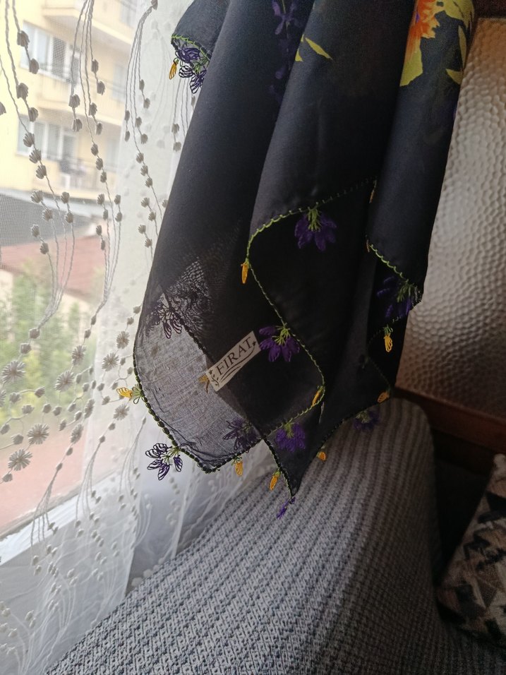 Bu bohem tarzda kadın fuları, koyu renkli çok renkli tekstil ve zarif boncuk detaylı kenarlarıyla retro ve hippie görünüme uygundur.