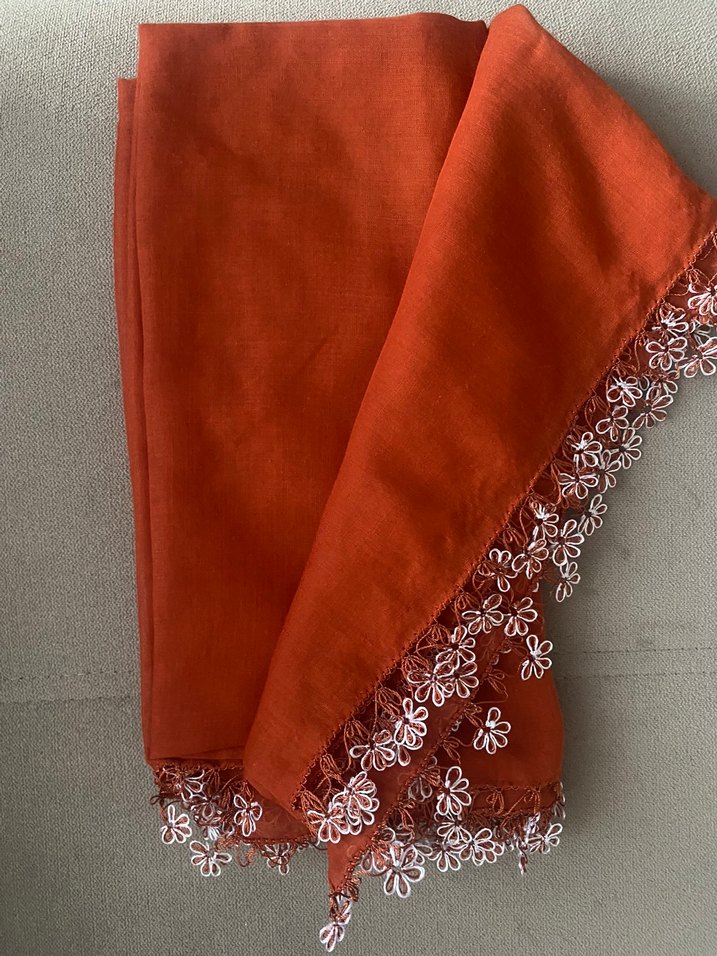 Sık işlemmiş tek renk turuncu iğne oyası yazma