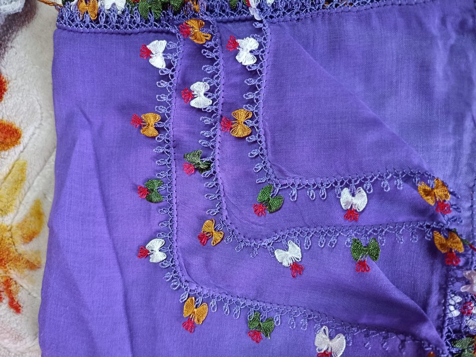Mor renkli tekstil fular, renkli kelebek nakışları ve narin dantel detaylarıyla bohem tarzını yansıtıyor.
