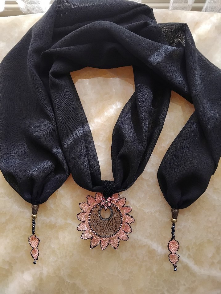 İpek dokusuyla siyah renkte, boncuk işlemeli bohem tarzda kadın fuları, retro ve hippie stiline uygun.