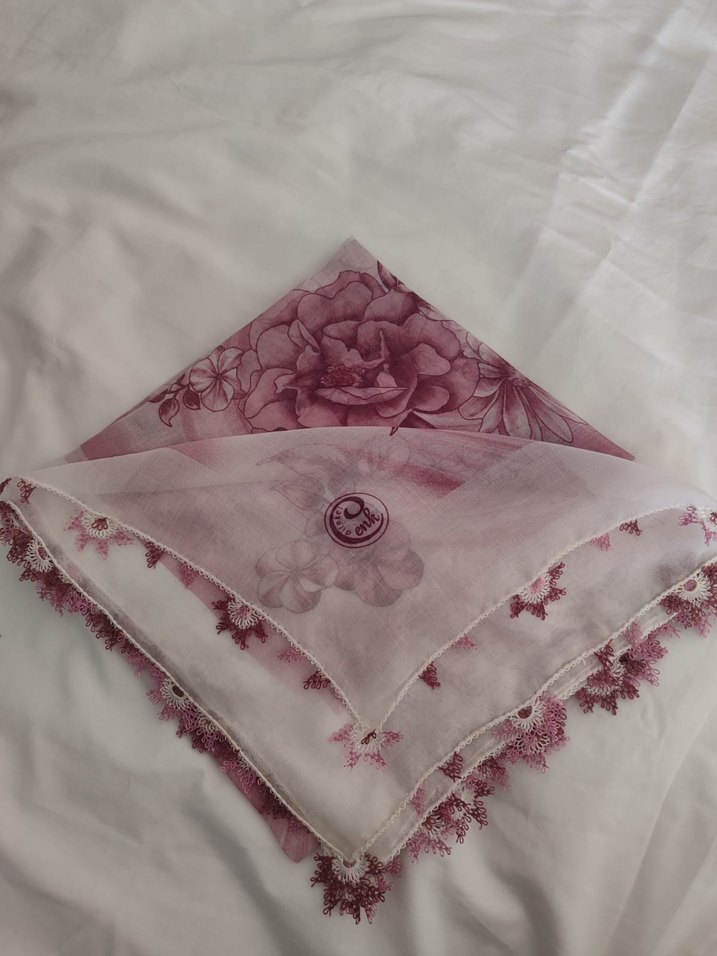 çiçek desenli pembe iğne oyası yazma,bohem ve retro tarzını yansıtır. Yumuşak pastel tonlarıyla feminen bir dokunuş sunar.