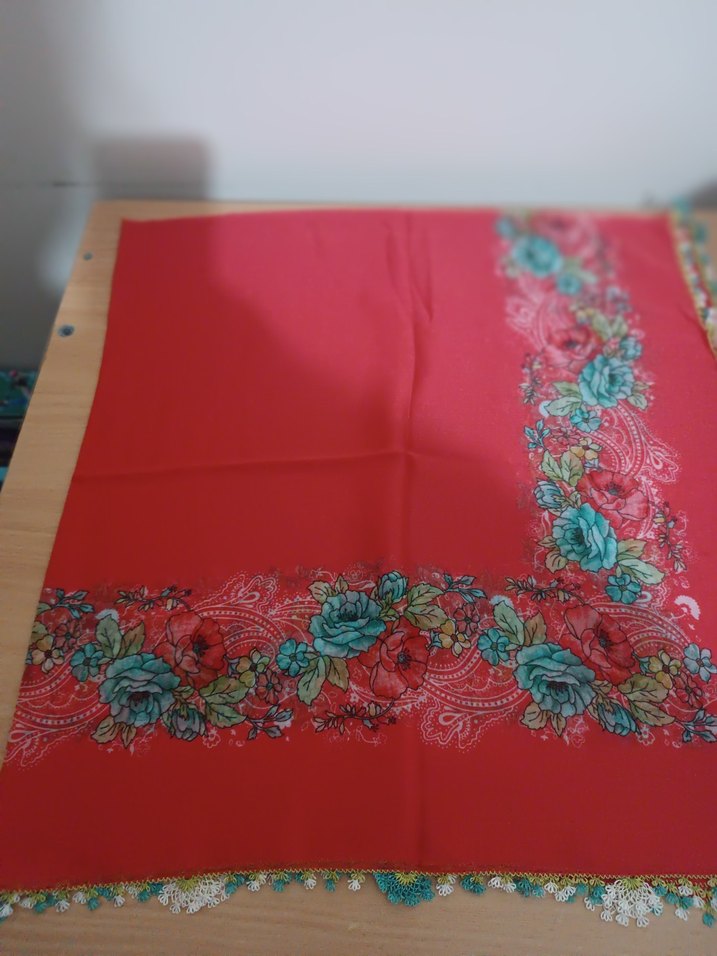 Kırmızı tekstil fular, dantel kenarları ve renkli çiçek desenleriyle bohem ve retro tarzı yansıtıyor.