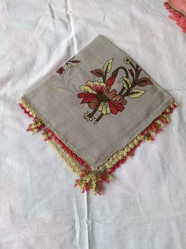 Gri zeminde nakışlı çiçek desenleri ve renkli detaylara sahip, püsküllü bohem tarz kadın fuları .