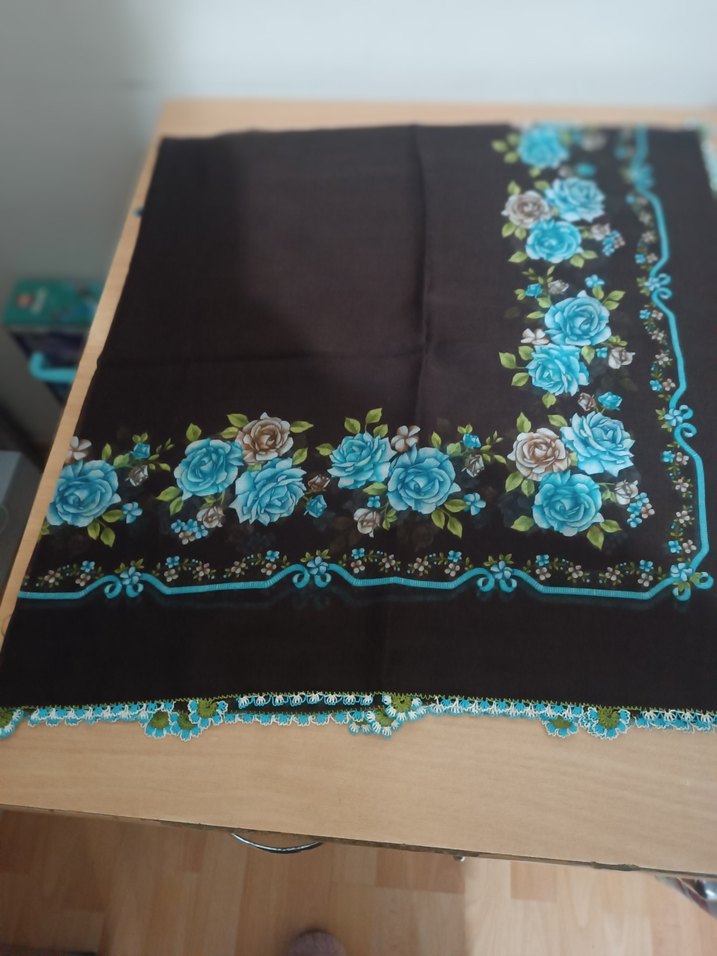 Kadın fular, koyu turkuaz çiçek desenli ve boncuk işlemeli kenarlarıyla, yumuşak sentetik kumaştan yapılmıştır. Bohem ve retro tarzlara uygundur.