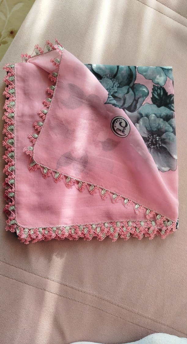 Pastel pembe renkte, dantel işlemeli ve çiçek desenli bohem tarzı kadın fuları.