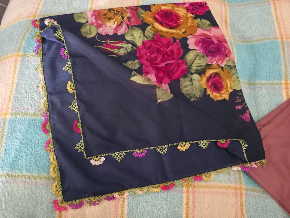 Koyu taban üzerine canlı çok renkli çiçek desenleri ve ince dantel kenarlarla bohem tarzda kadın fuları.