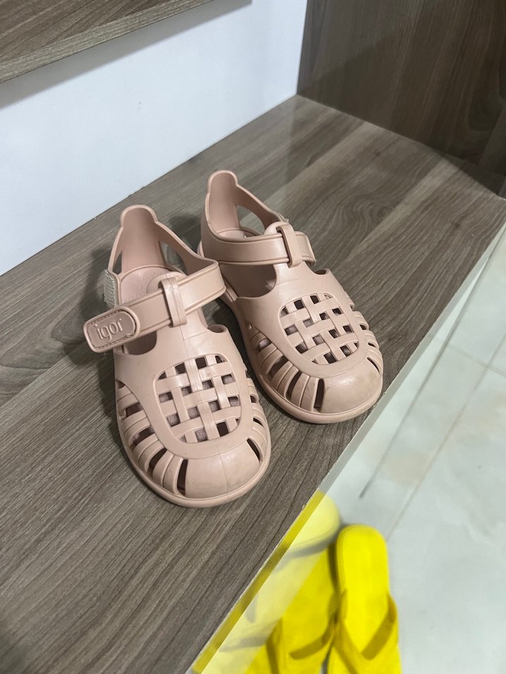 Pastel bej renkte, tokalı ve kare desenli kız çocukları için kauçuk sandalet. Rahat ve sade tasarım.