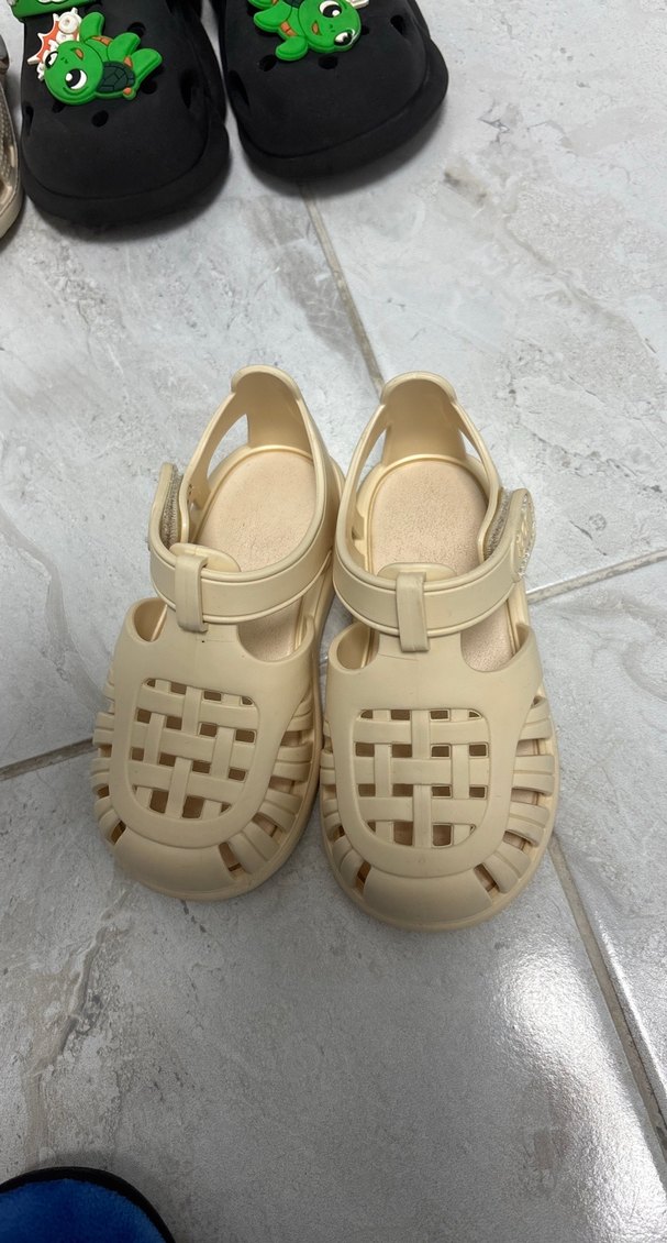 Bej renkte, tokalı bantlı çocuk sandaletleri. Lastikten üretilmiş, üst kısmı örgü desenli ve açık tasarımlı sokak stili sandaletler. İgor sandalet cırt kısmında tadilat oldu o yüzden fiyatı uygun tutuyorum