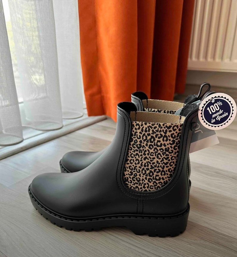 Siyah kauçuk kadın botları, yüksek topuklu ve leopar desenli yan panelleri tokalı detaylarla tamamlanmıştır