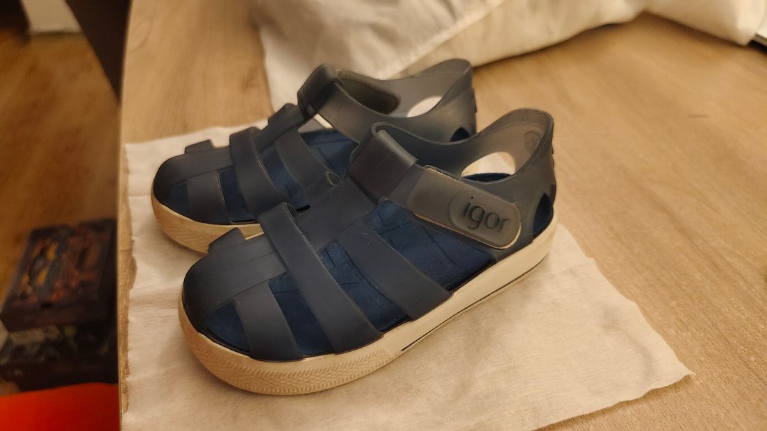 Igor markalı,lacivert renkte. İtalyan marka. Oğlum büyüyene kadar her numarasını aldım. çok kullanışlı ve rahat. iç tabanını çıkardığınızda sahilde de giyilebiliyor. Az kullanıldı yepyeni duruyor.