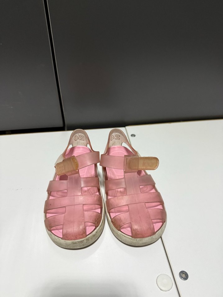 Kız çocukları için pastel pembe renkte, tokalı ve kauçuk malzemeden yapılmış sandaletler. Sokak modasına uygun tasarım. Hiç bir deformasyonu yok, yeni gibi