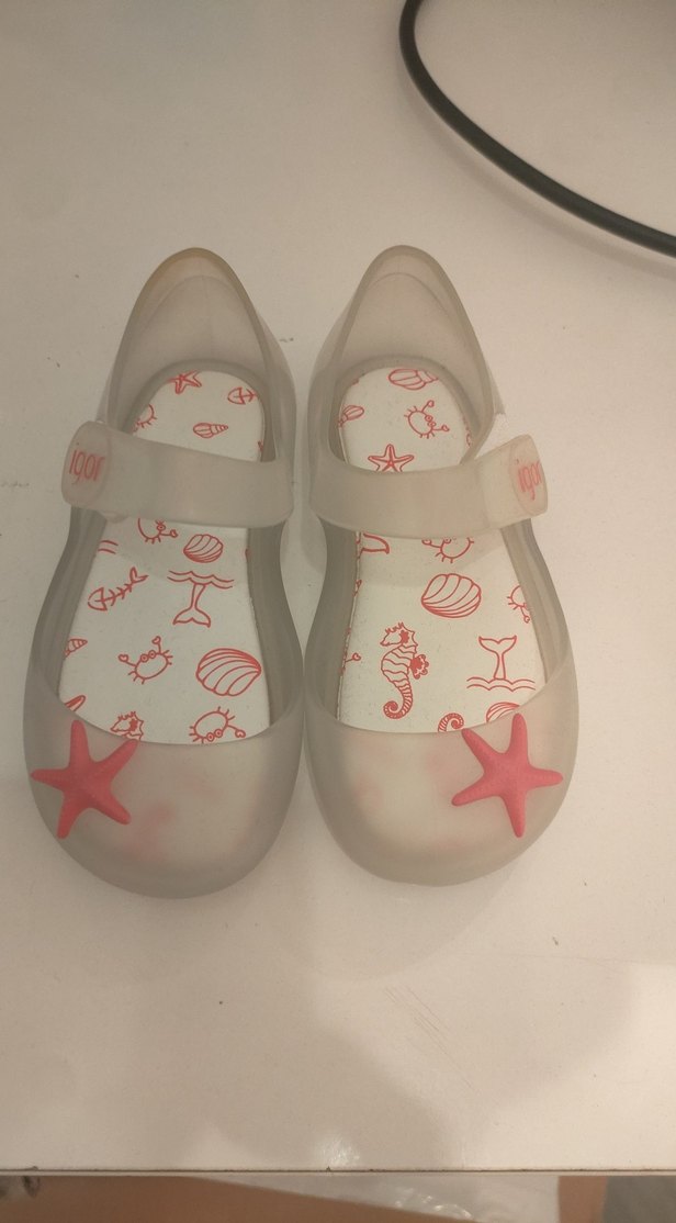 Seffaf renkli kız çocuk terlikleri, deniz temalı desenli iç taban ve kolay kapanan cırt cırtlı bant ile tasarlanmıştır. Yumuşak kauçuk malzeme ve parmak ucunda deniz yıldızı detayı bulunur.