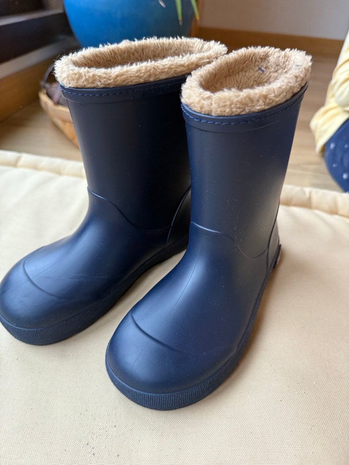 Lacivert erkek çocuk lastik botlar, içi kürklü ve ısıtıcıdır. Düz ve desensiz tasarıma sahiptir, günlük kullanıma uygundur.