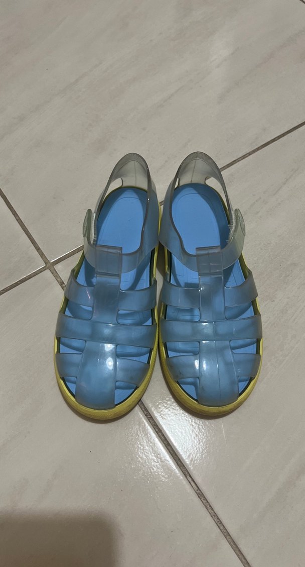 Erkek çocuklar için mavi tokalı sandaletler. Kauçuk malzemeden üretilmiş, pastel renkli ve desen içermeyen sokak tarzı bir model. Sarı taban detayı bulunur. 30 numara 3-4 kere giyildi.