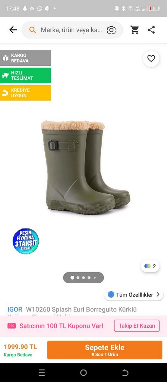 Orijinal IGOR markadır. hiç kullanılmamıştır. • Su geçirmez • İç kısmı kürklü • Kaymaz taban • Soğuk ve yağmurlu havalar için ideal Trendyol satış fiyatı 2000 TL’dir. Kutu yok Hızlı kargo