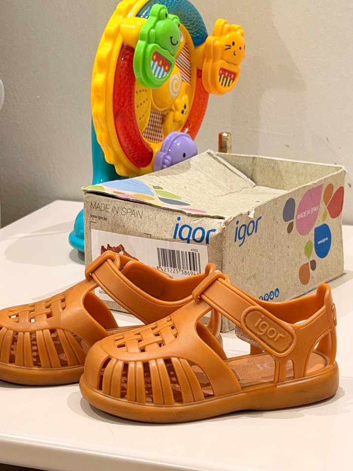 Çocuklar için renkli kahverengi kauçuk sandalet, cırt cırtlı kayışlı, retro tarzda Igor markası. Rahat ve kullanışlı. Çok az giyildi tabanından bellidir tertemiz