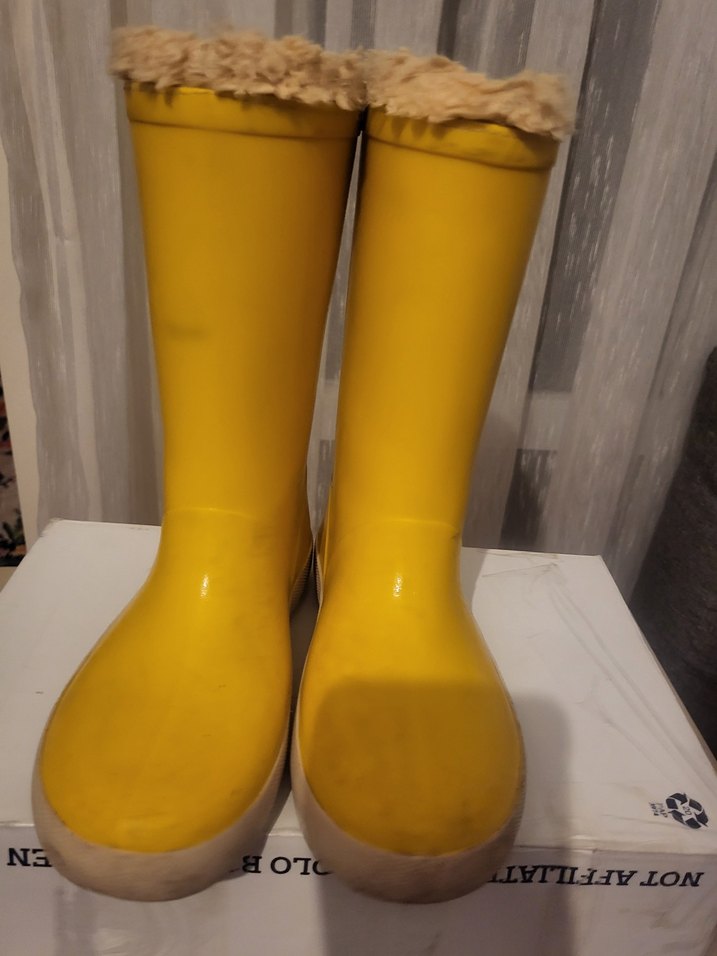 Parlak sarı kauçuk yağmur çizmesi, tüylü detay içerir. ☔️