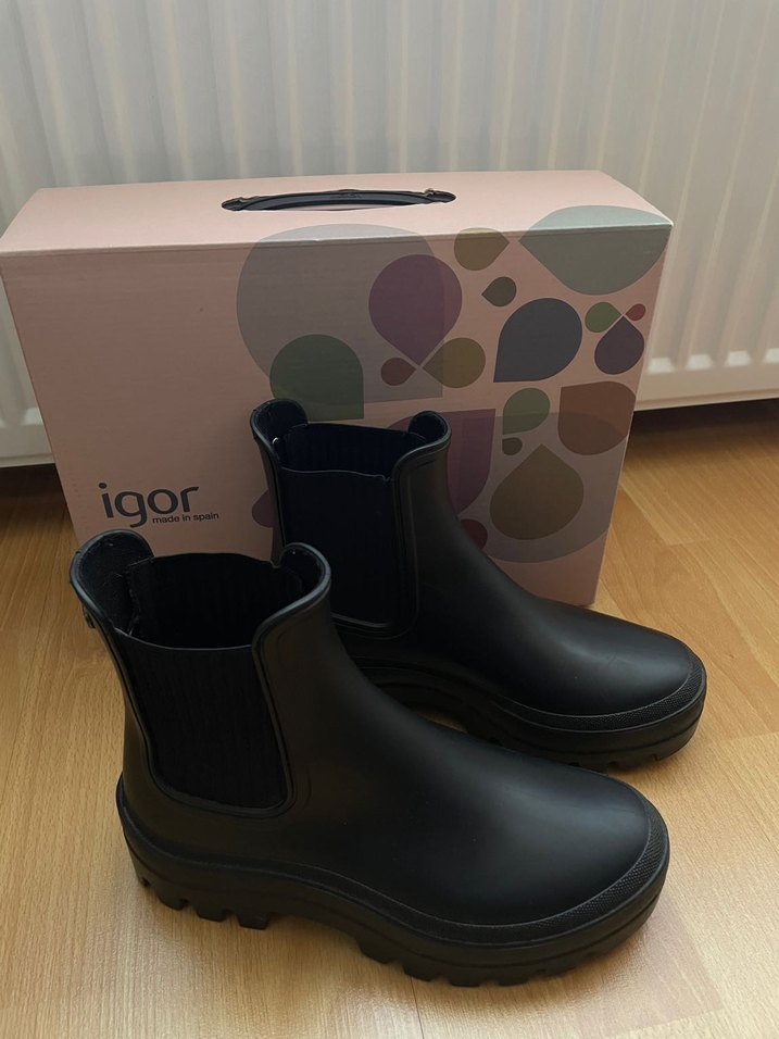 Igor markalı siyah kauçuk kadın bot, blok topuklu ve desen içermeyen sade tasarımıyla günlük sokak stiline uygun.
