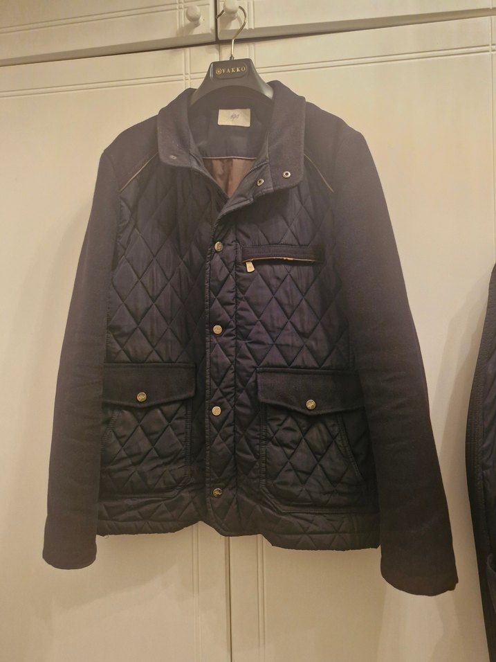 Düğmeli ön kısmı ve kesik yaka detaylı koyu lacivert kaşe mont Uzun kollu, normal boy ve günlük sokak stili için uygun.
