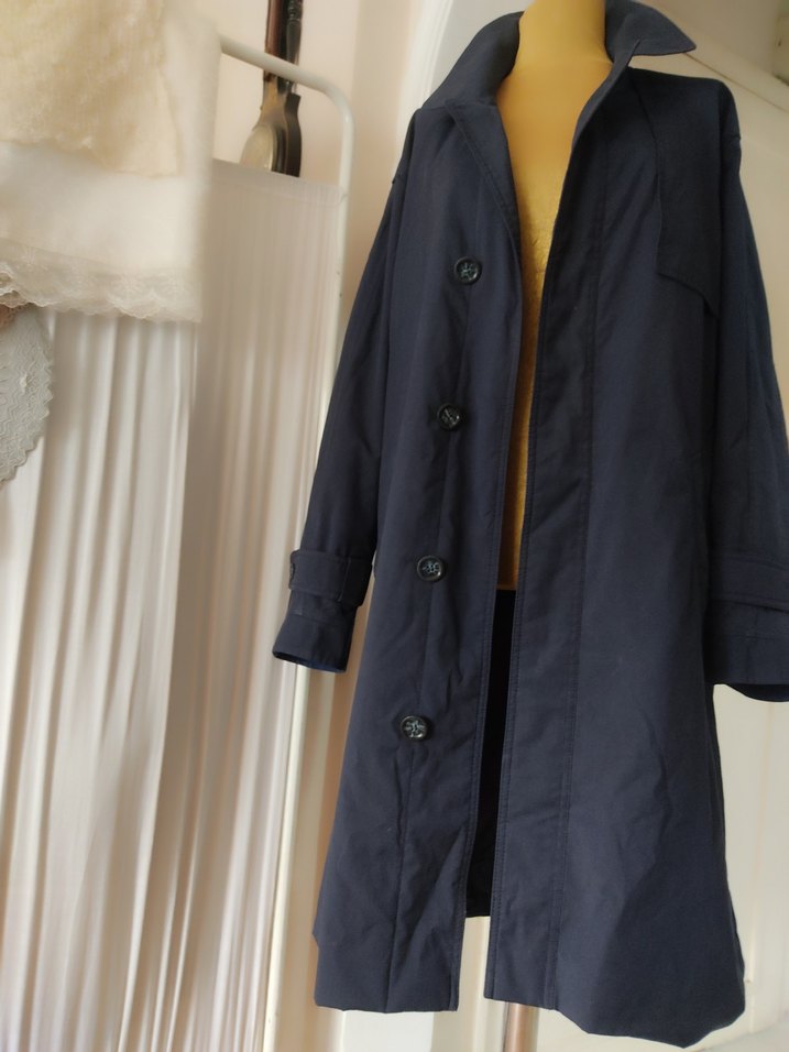 Lacivert uzun trençkot, yakalı ve düğmeli ön tasarıma sahiptir. Uzun kollu, bol kesim ve ipeksi dokulu kumaştan yapılmıştır. Günlük kullanıma uygun, sade ve minimalist tarzda. ️