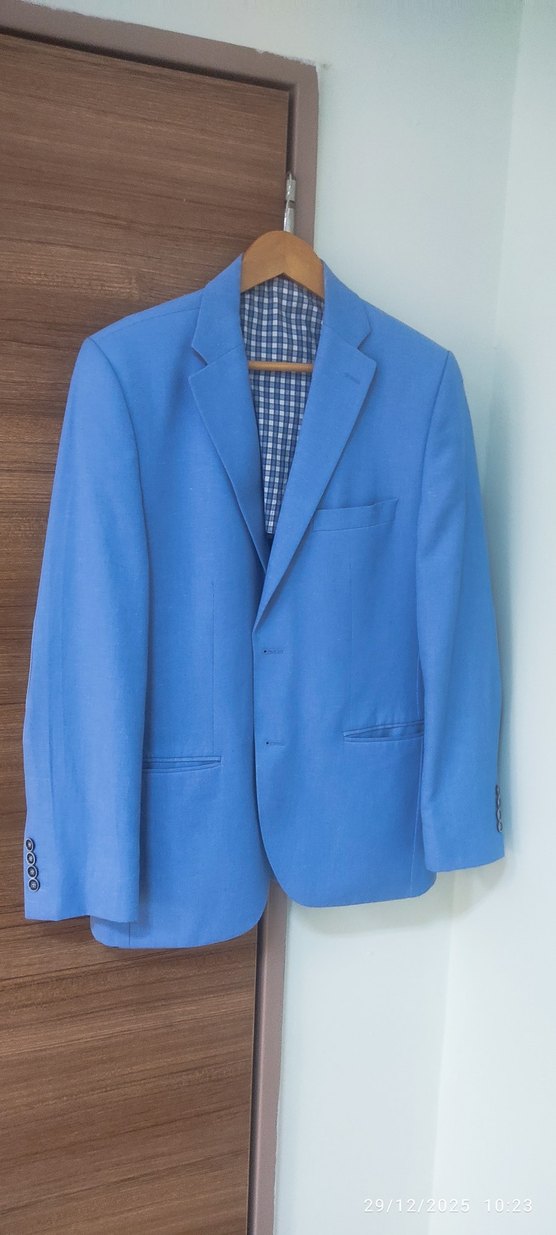 igs marka 50 beden Mavi renkli erkek takım ceketi, normal kesimde ve düğmeli. Uzun kollu ve parlak yüzeyli, ofis kullanımı için uygundur.
