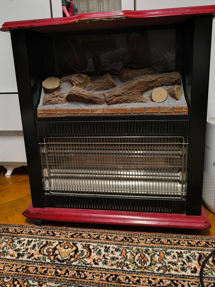 Koyu kırmızı renkte, önünde kütük desenli ve metal koruma ızgaralı ısıtıcıdır.