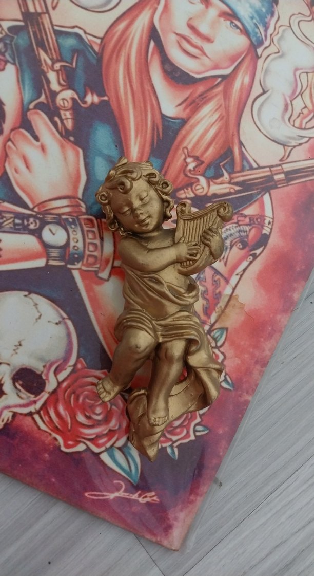 Parlak altın renk, lir çalan melek figürü.