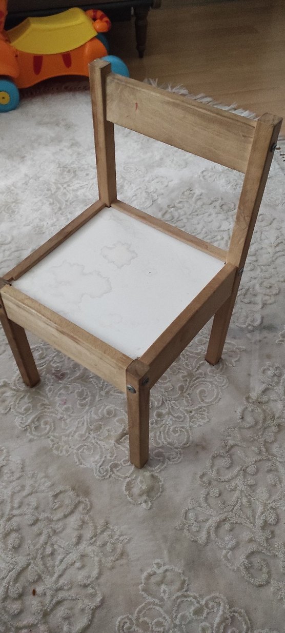 Ahşap çerçeveli, beyaz oturma yüzeyli çocuk sandalyesi, sağlam ve sade tasarıma sahiptir.