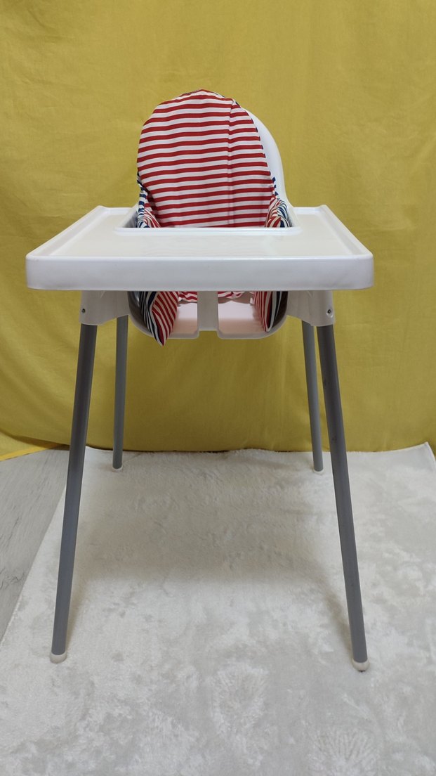 Kırmızı beyaz çizgili oturma minderi, beyaz tepsi ve gri ayaklara sahip bebek mama sandalyesi. ️