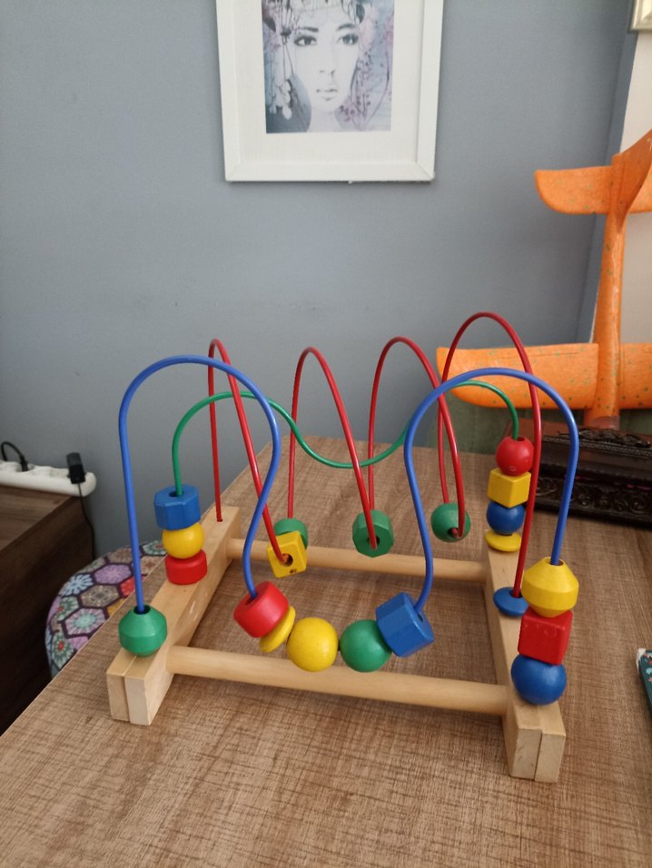 Oğlum haşin biri diye zamanında piyasayaki en sağlam olanını aldık. O da IKEA da satılıyordu. Sağlamda bir para verdik. Masif ahşap sağlam vidalı öyle ince kavak çıtası sunta vb. değil atsanız vursanız bile sapasağlam bir ürün Büyük boy 25 x 35 cm . Boncuklar falan sapasağlam durumda toz ve ufak lekeler dışında hiçbir problemi yok. Onlarda silinirse geçer. Hem zeka gelişimi hem motor becerileri hem de eğlenmek için bire bir bir oyuncak