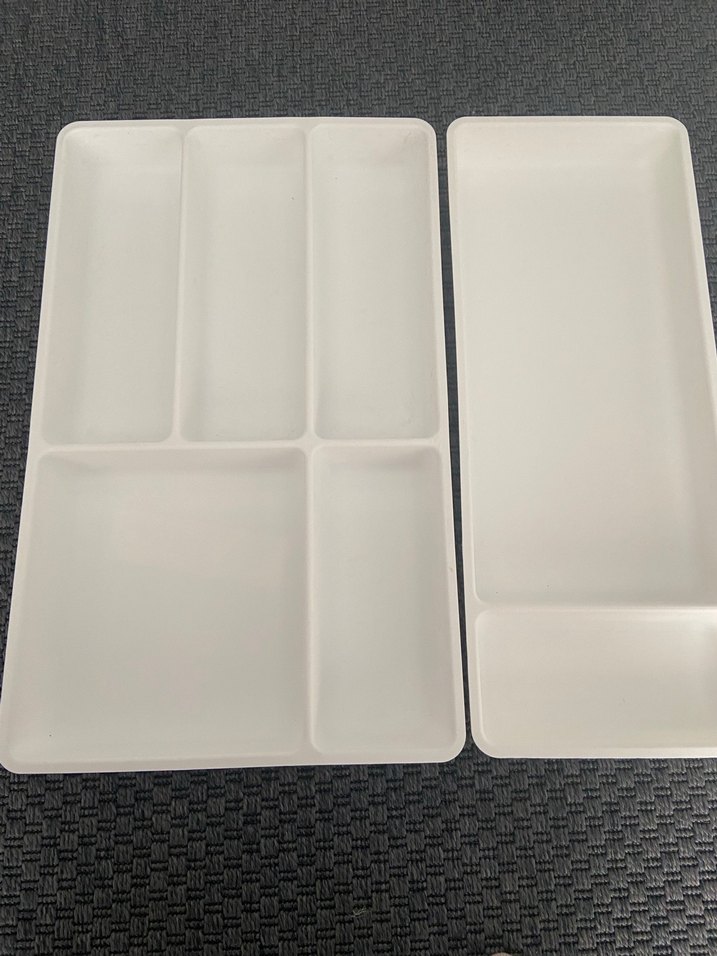 İki parçadan oluşan beyaz çekmece organizeri seti, çekmecelerin düzenli saklanması için çeşitli bölmelere sahiptir.