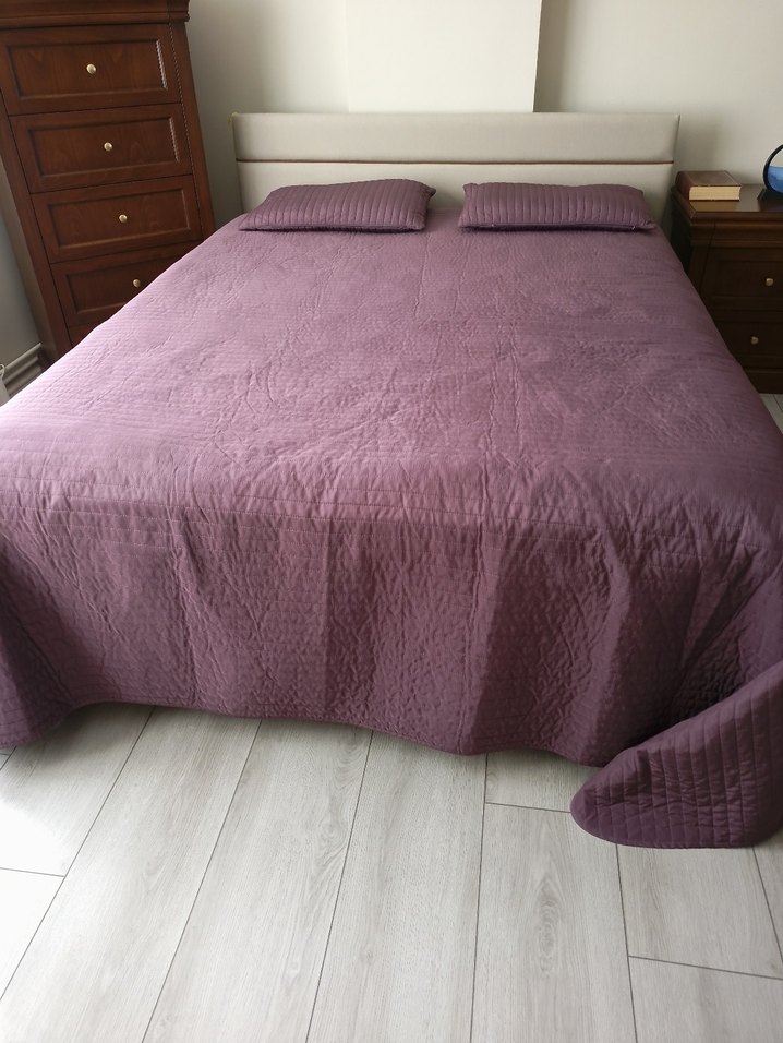 Ikea karit mor renkte, çift kişilik yatak örtüsü, yatak odanıza sakin ve rahat bir hava katar. deformesi yoktur. yastıkları içleri ile beraber verilecektir ️