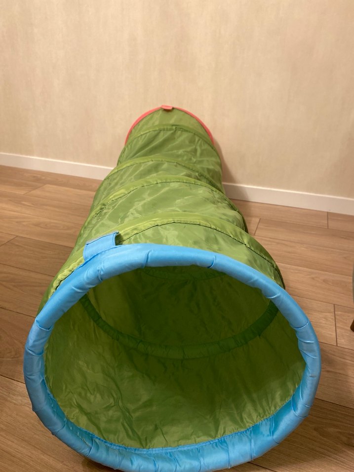 Yumuşak ve hafif kumaştan yapılmış, mavi ve kırmızı detaylı renkli yeşil çocuk oyun tünelidir. Eğlenceli ve güvenli oyun alanı sunar.
