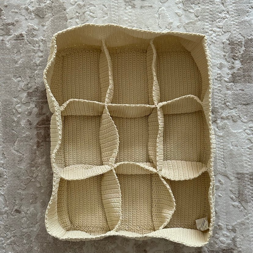Oldukca saglam bir malzemesi var. Ağırdır. Örgüdür. Hicbir yırtık vs yoktur. Olculeri : boyut 40x50x15 cm , Yükseklik 15 cm, Her bir gözü yaklaşık 13x18 cm boyutunda