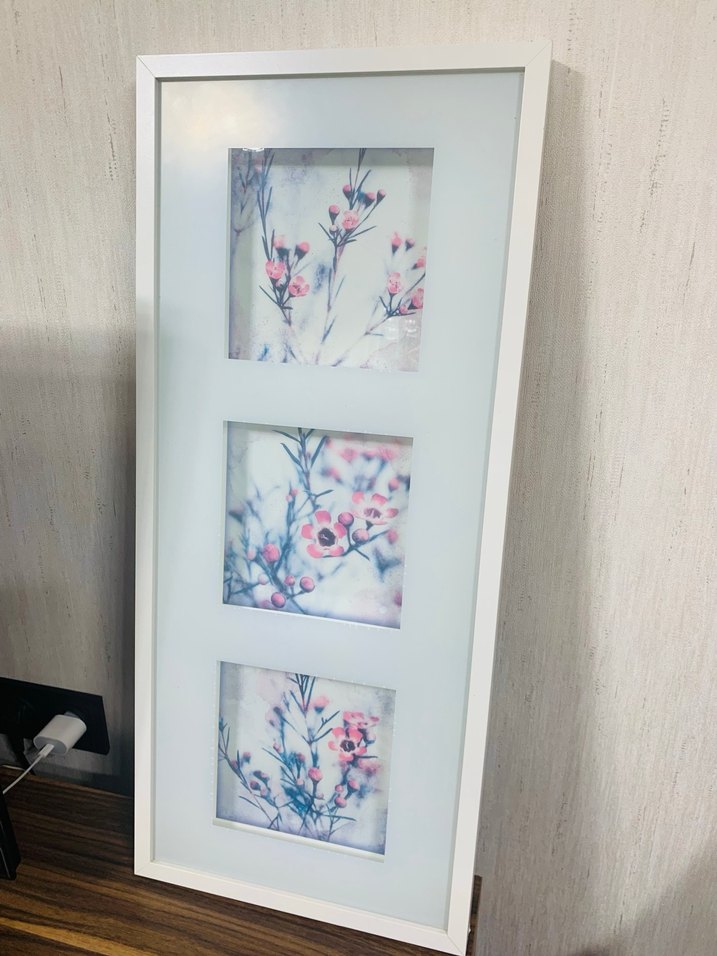 Tertemiz kusursuz yeniden farksızdır. 71x31 cm ölçüleri vardır Beyaz çerçeveli bu tablo, üç adet pastel tonlarda çiçek görseli içerir. Üst üste dizilmiş, pembe çiçekler ve yumuşak arka planlar sunar.