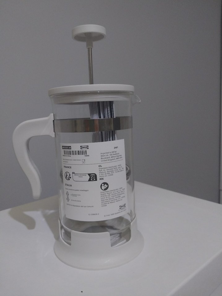 Beyaz ve gri renklerde, cam gövdeli, kullanışlı kulplu ve metal pistonlu çay demliği.