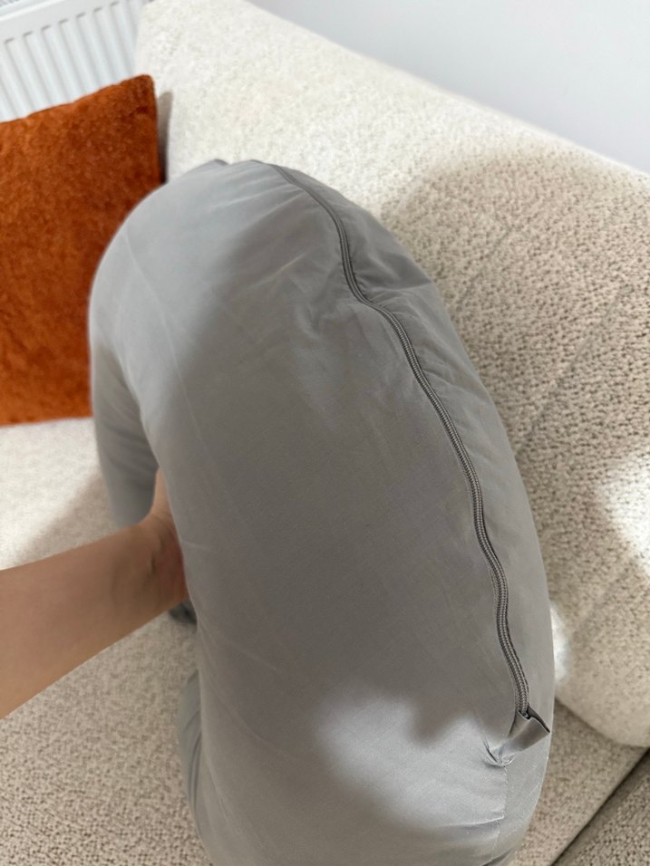 Gri renkte, desensiz yüzeye sahip emzirme ve hamilelik yastığı, rahat destek sağlar. Hiç kullanılmadı