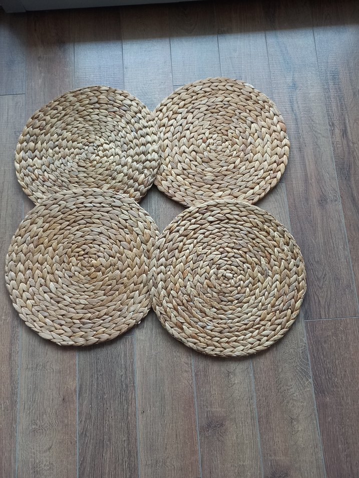Bej tonlarında doğal dokulu, yuvarlak ve hasır görünümlü dört adet bohem tarzda Amerikan servis seti. ikea su sümbulu servis sltligi olarak tanesini200 tl ye yilbasi icin aldim. 1 gece kullandik. çook ucuz verecegim son fiyat hepsi 320 tl.
