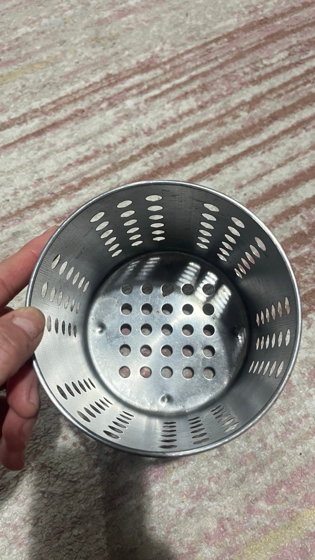 Kullanılmış . Sorunu yok . Yıkayıp kullanabilirsiniz Delikli, gri metal malzemeden yapılmış, mutfak gereçlerini düzenlemek için kullanılan bir aksesuar. İkea marka
