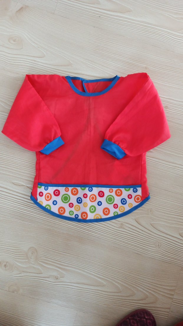 Uzun kollu, kırmızı renkte bebek önlüğü. Cep kısmında renkli dairesel desen ve mavi detaylar bulunur. sorunsuzdur 2-3 yaşa uygundur