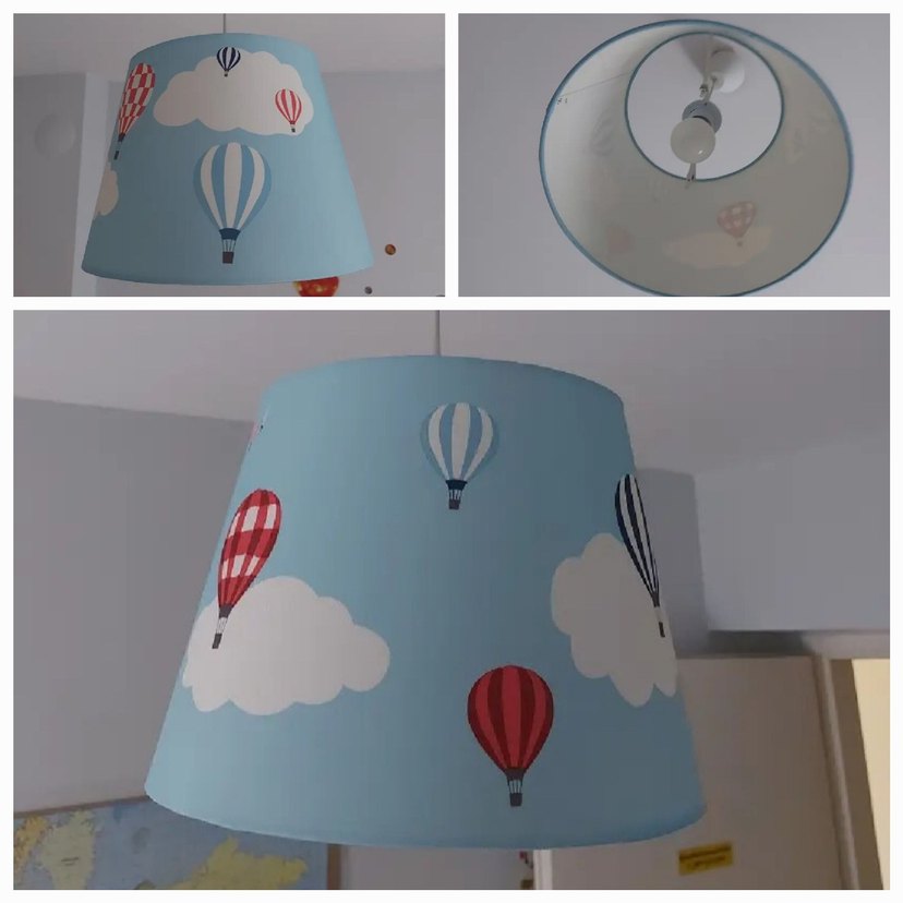 Bu tavan lambası, üzerinde renkli sıcak hava balonları ve bulutlar bulunan açık mavi bir abajura sahiptir. Odaya neşeli bir hava katar ve yumuşak ışık sağlar. çok az kullanıldı tarz değişikliğine gittiğim için satıyorum.