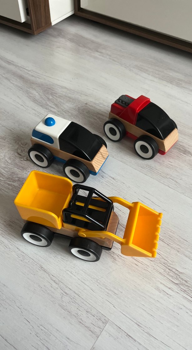 Kırık eksik yok.Sarı kepçeli ve siyah-kırmızı detaylı iki küçük arabanın olduğu renkli ahşap oyuncak araba seti.